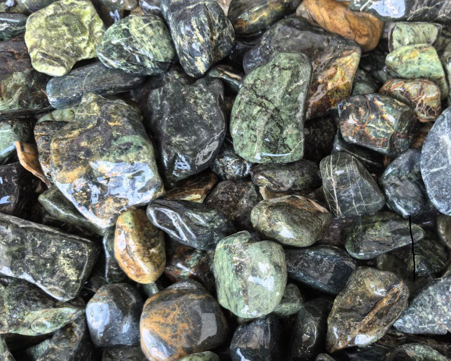 С помощью абразивов крошка серпентинита на специальном оборудовании окатывается (галтуется), придавая камню декоративный вид, гладкость и яркость.